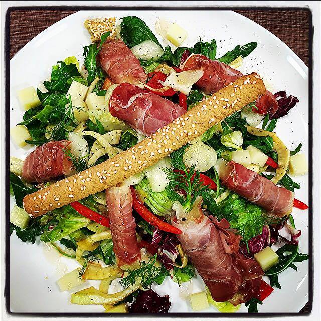 Put all the vegetables in a bowl. Add the pepper. Sprinkle with olive oil and the balasamico. Sprinkle the cheese and mix well. Spread on a platter and break on top the breadsticks. Put in the center the prosciutto rolls with the cheese.