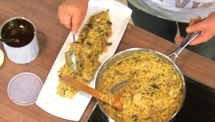 Heat the rest of the oil and saute the onion for a few minutes. Add the garlic and then the 'kritharaki' past, butt in and add the mushrooms and 1/3 of the broth, butt in until the liquid is evaporated. Put inside the rest 1/3 of the broth, butt in and boil the 'kritharaki' pasta.